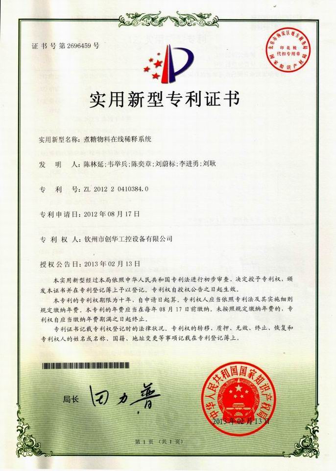 近日,我公司自主研發(fā)的“煮糖物料在線稀釋系統(tǒng)”獲得國家知識產(chǎn)權(quán)局實用新型專利授權(quán)。本系統(tǒng)是我公司針對糖廠目前在結(jié)晶過程中間歇入料,不能做到沸點入料及任意錘度稀釋的現(xiàn)狀而自主研發(fā)的,該系統(tǒng)安裝在原料箱和煮糖罐之間,通過PLC控制,實現(xiàn)入料溫度可調(diào),入料錘度可調(diào),并且在結(jié)晶過程中能實現(xiàn)連續(xù)入料,為結(jié)晶過程的平穩(wěn)進行創(chuàng)造有利條件。該系統(tǒng)的應(yīng)用,對于糖廠節(jié)能降耗和提高回收有一定的幫助。